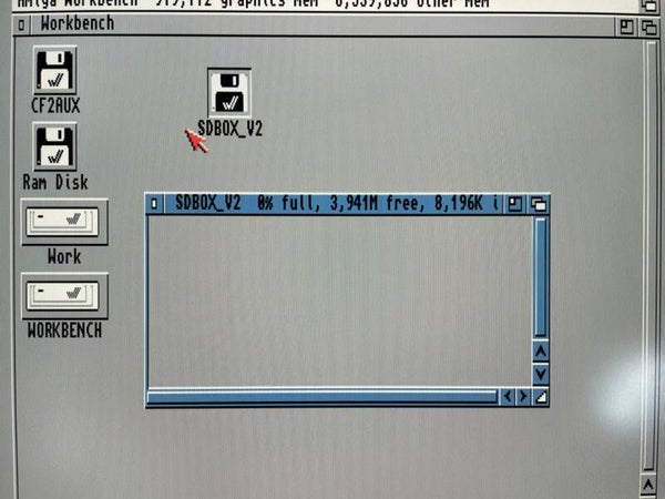 SD cards are displayed like any other device or partition in Amiga, so you can easily read and save files from your Workbench desktop. SDBox uses the FAT32 file system, so this is a great choice to transfer files between your Amiga and other devices, such as PC or Mac computers.